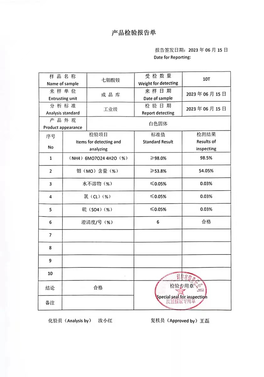 鉬酸銨(又特種鉬酸銨;(T-4)-鉬酸銨;四鉬酸銨;鉬酸二銨;)易於純化、易於溶解、易於熱解離,而且,熱解離出的NH3氣隨加熱可充分逸出,不再污染鉬產品。因而,鉬酸銨廣泛用作生產高純度鉬製品的基本原料。鉬酸銨也常用作生產鉬催化劑、鉬顏料等鉬的化工產品的基本原料。主要用途: 石化工業用作催化劑,冶金工業用於制鉬粉、鉬條、鉬絲、鉬坯、鉬片等,亦可作為微量無素肥料,製造陶瓷色料、顏料及其它鉬的化合物的原料